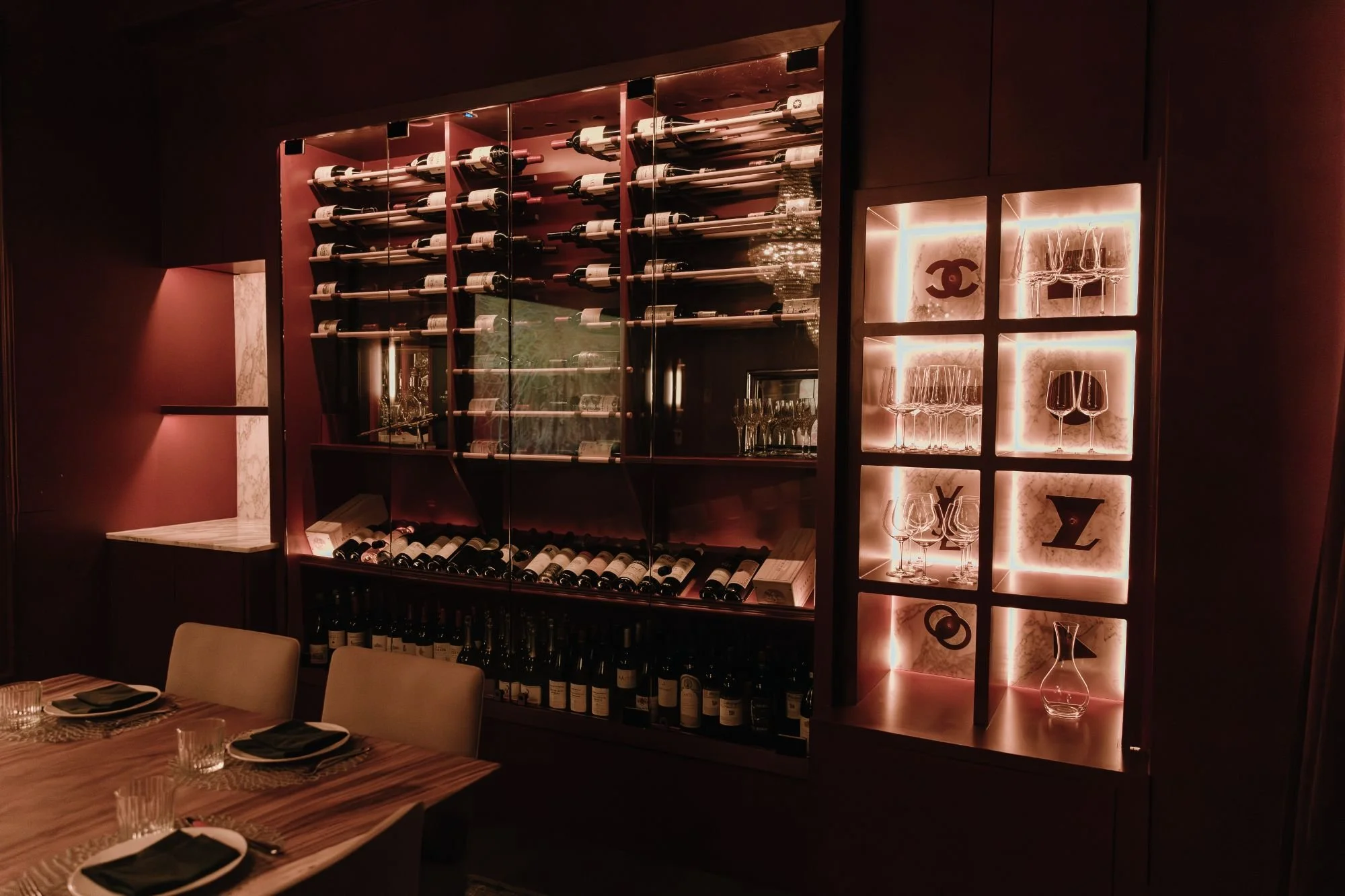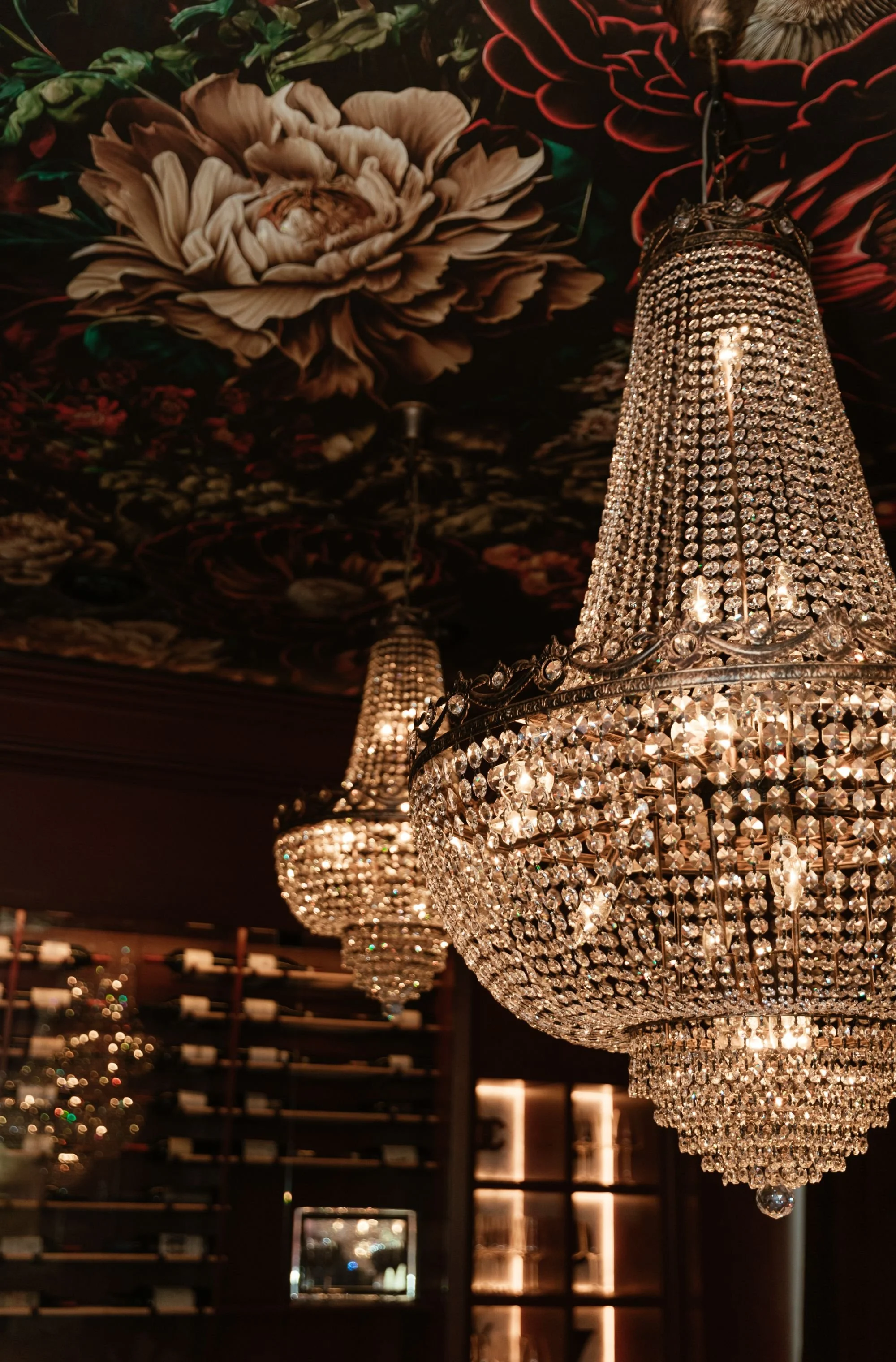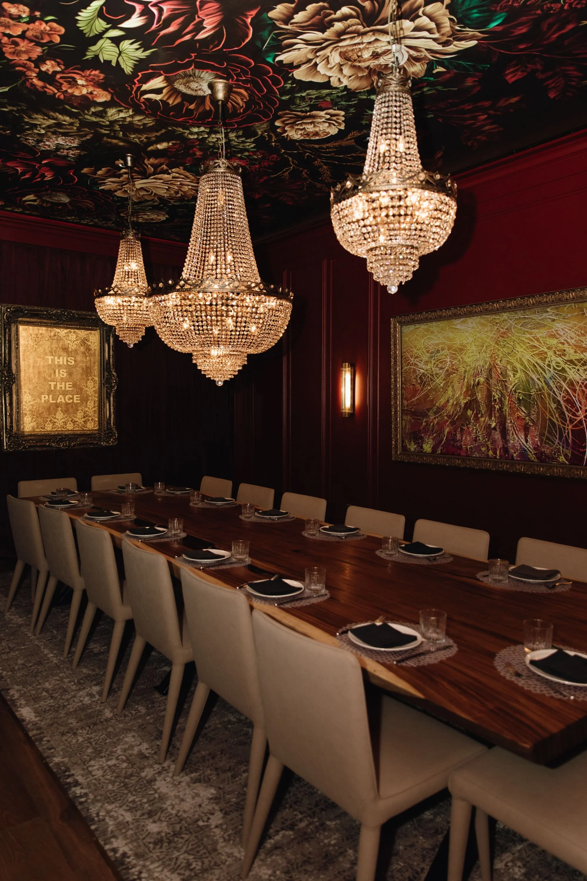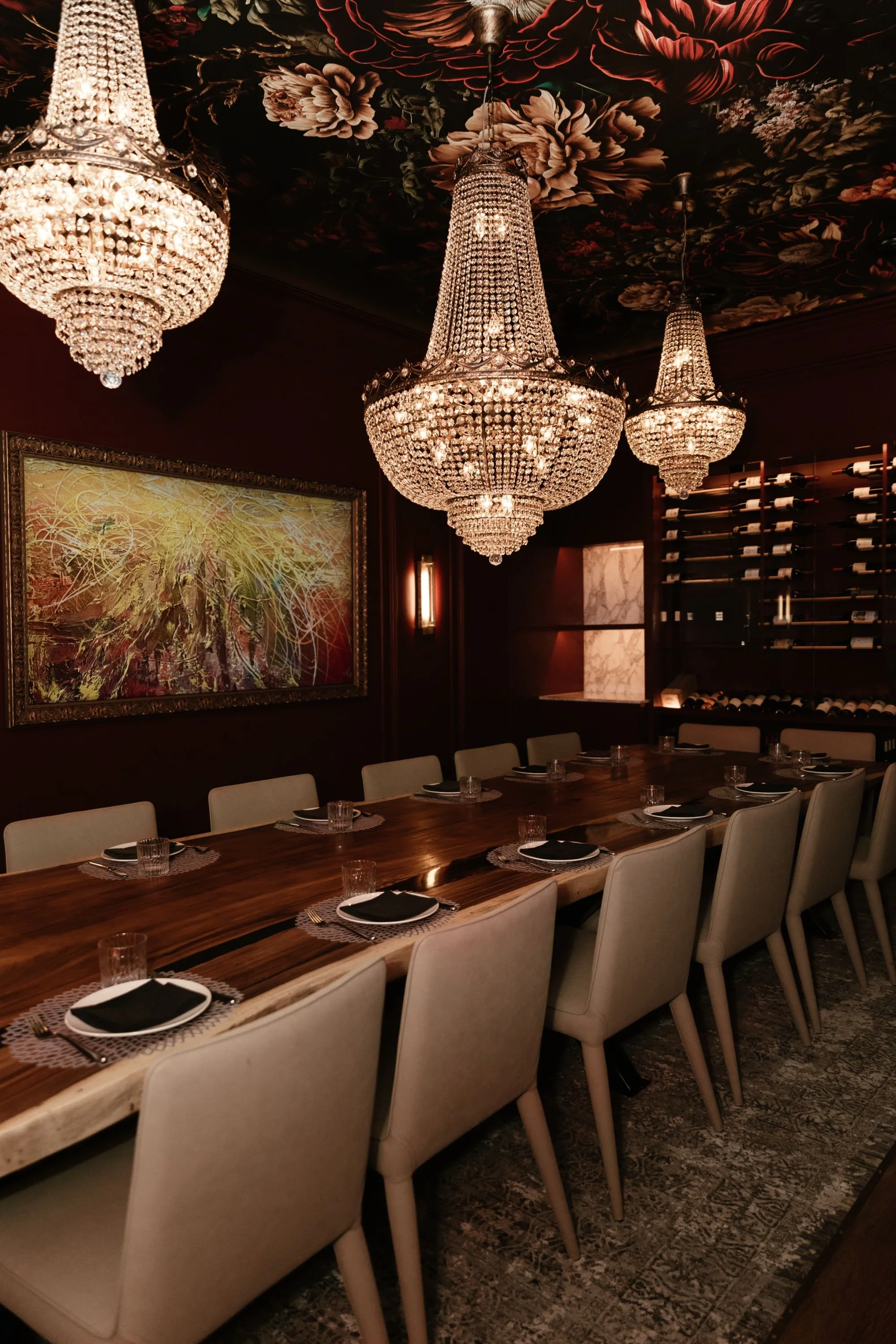 Overhead, a trio of statement crystal chandeliers and a dramatic floral ceiling mural establish a sense of occasion, while a curated wine wall and soft, ambient lighting add depth and functionality. Thoughtfully scaled yet highly detailed, the PDR offers a refined, transportive setting designed for memorable, shared experiences.