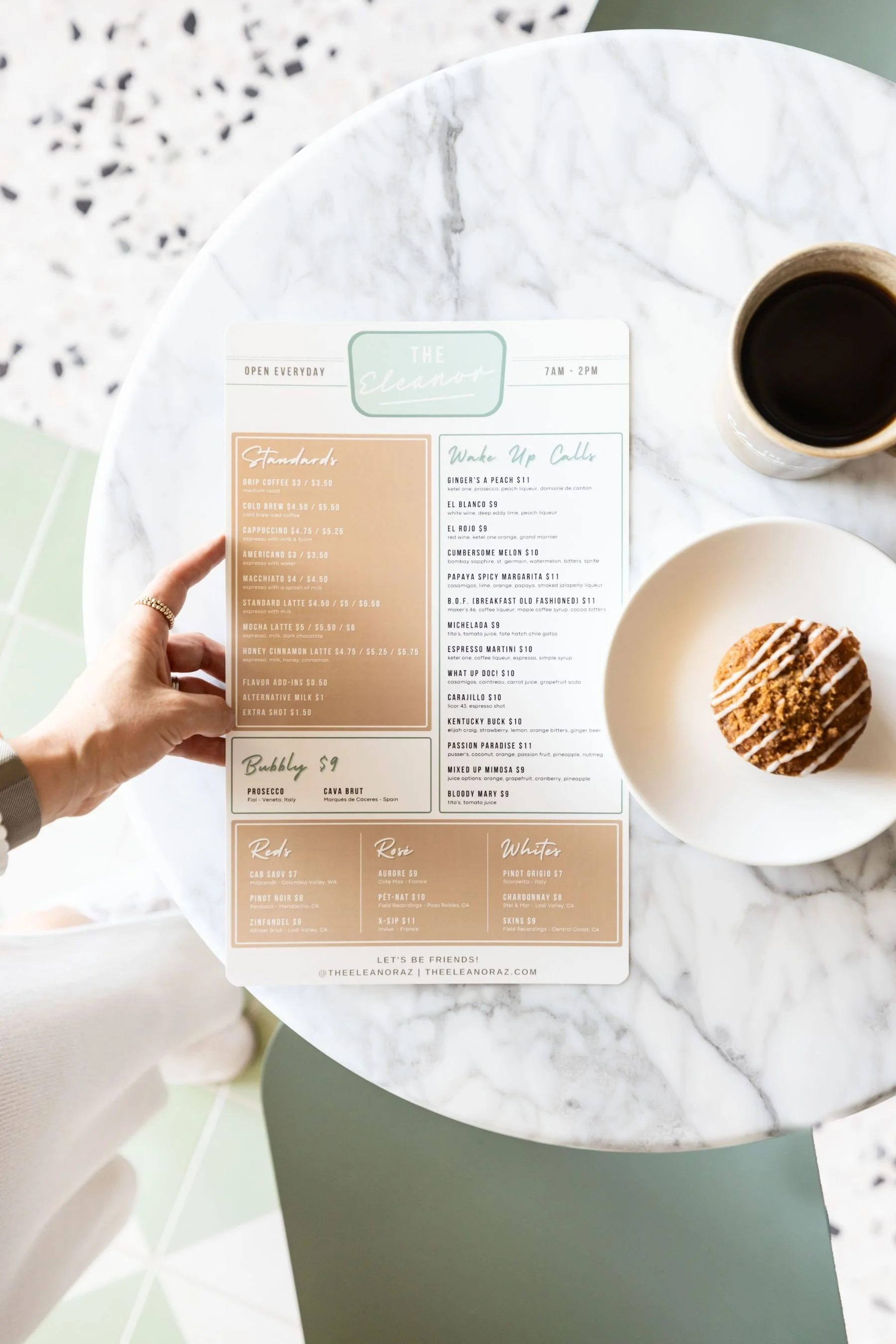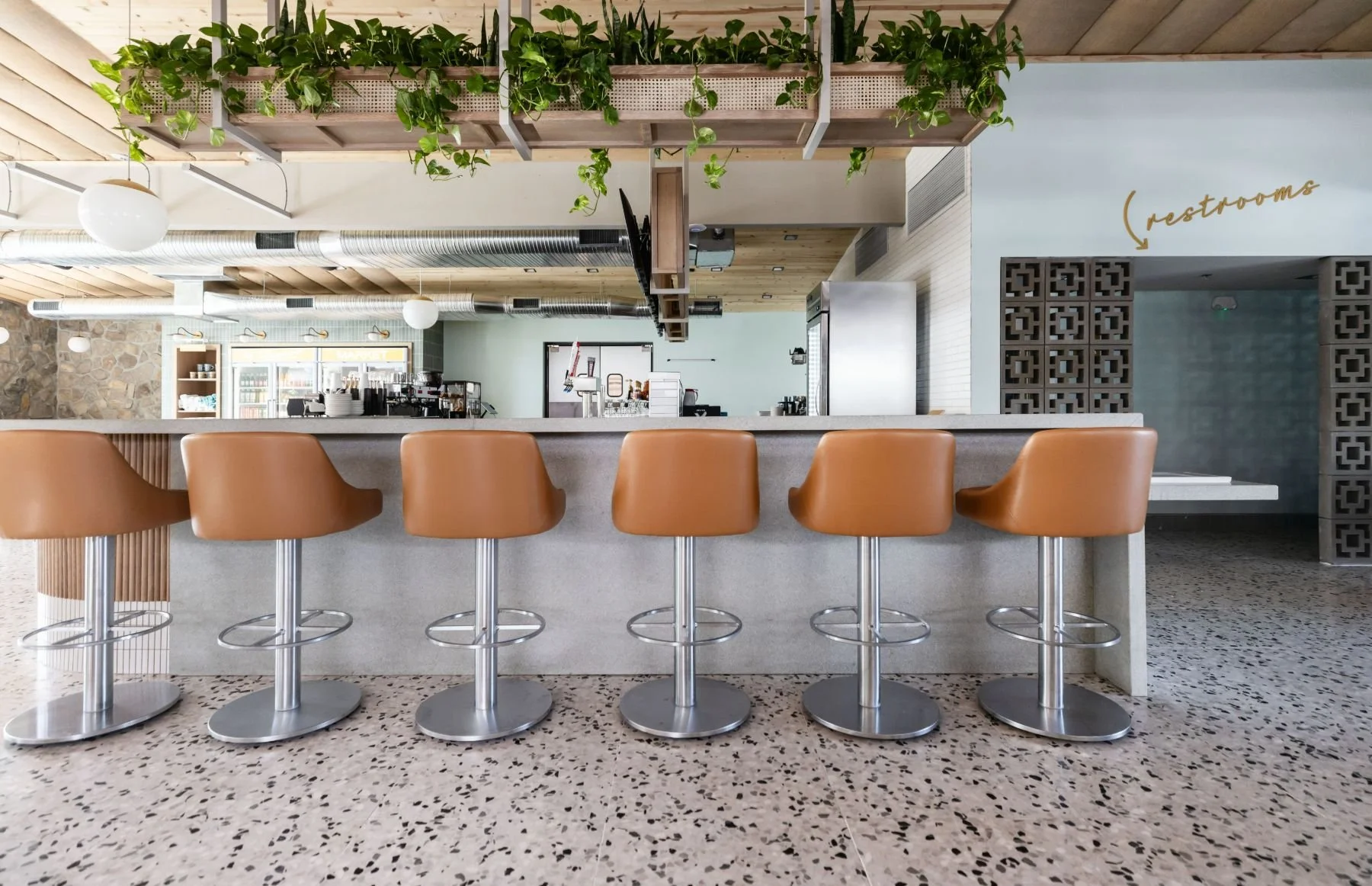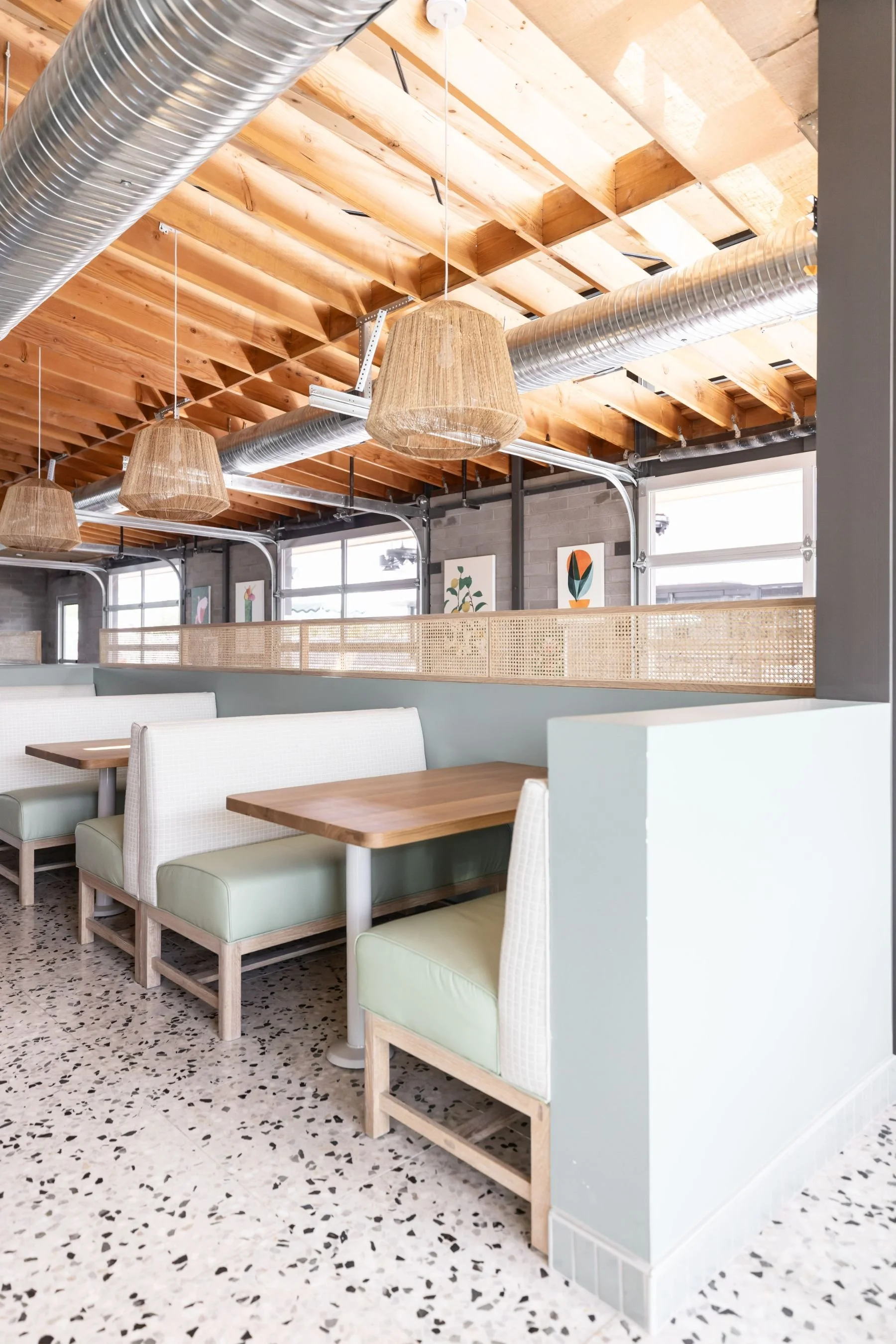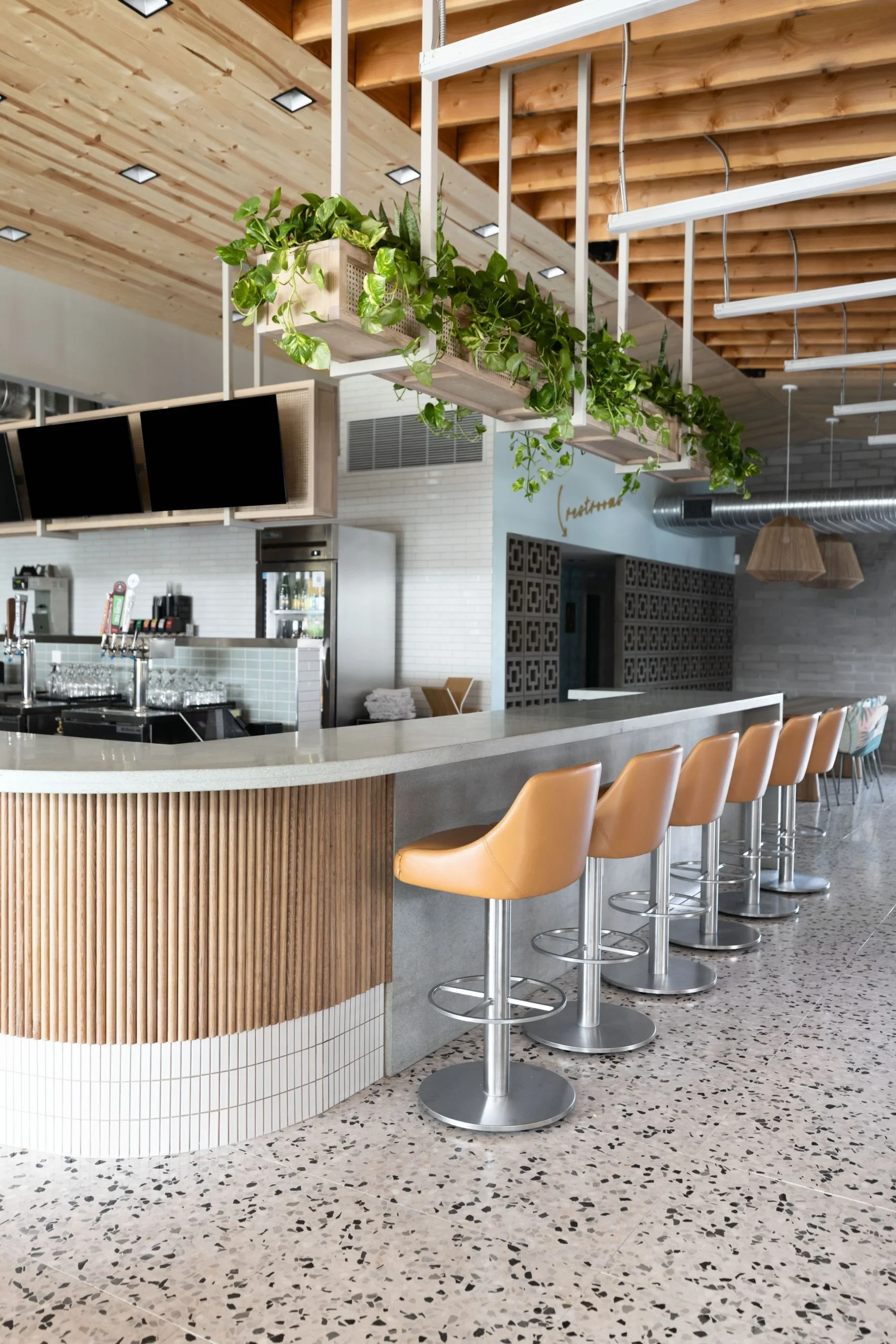 Scottsdale, ArizonaThe Eleanor is a fresh take on midcentury modern design, blending it seamlessly with a sunny Palm Springs charm. It’s bright and breezy, designed to make you settle in for a slow brunch and one more cup of coffee. From the mint green terrazzo bartop to the bold floral fabrics and terrazzo tile underfoot, every detail feels fresh and playful. Custom white oak tables and millwork bring in a layer of warmth, while curated artwork adds those little touches that make the space feel special. It’s welcoming, elevated, and fun – just as we designed it to be.
