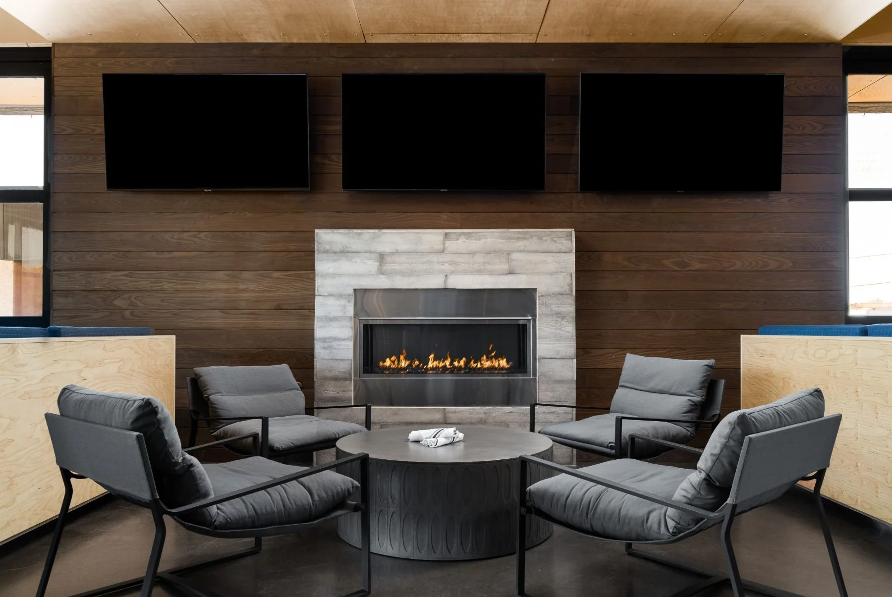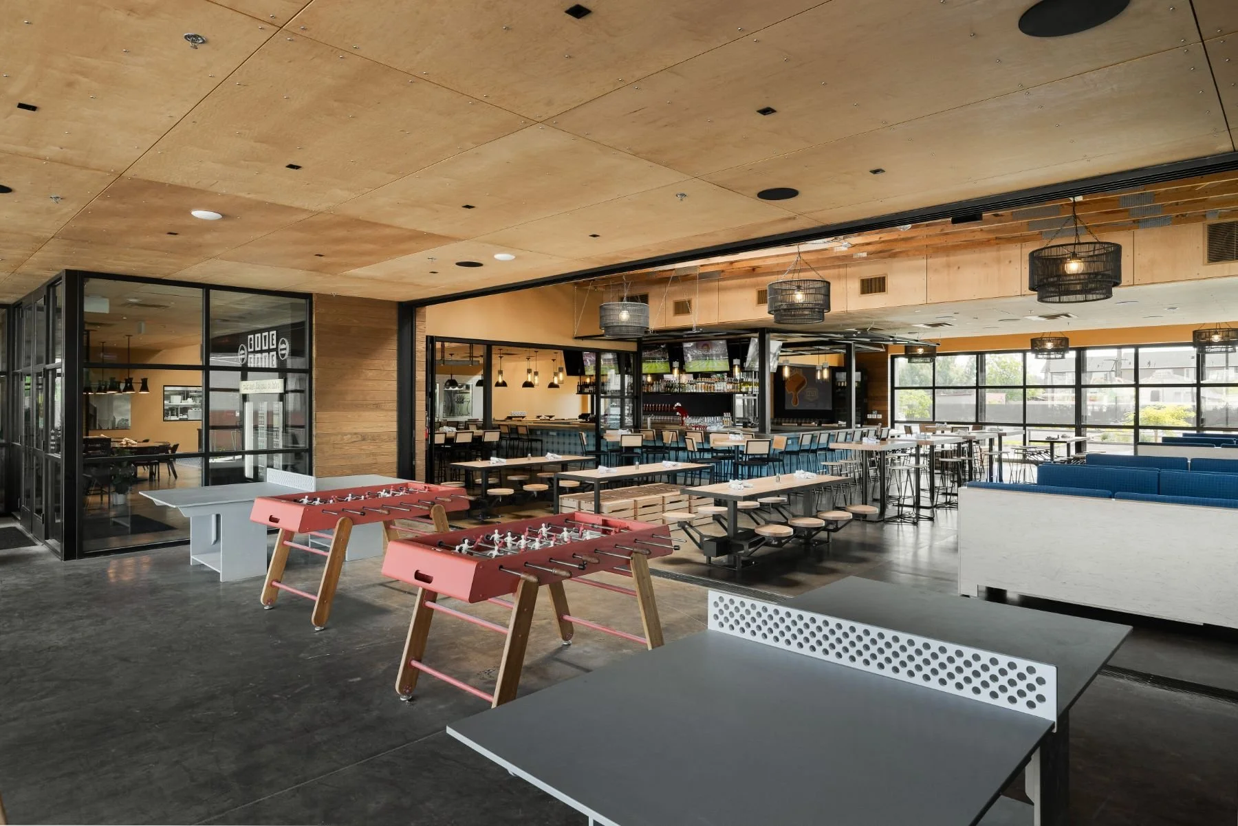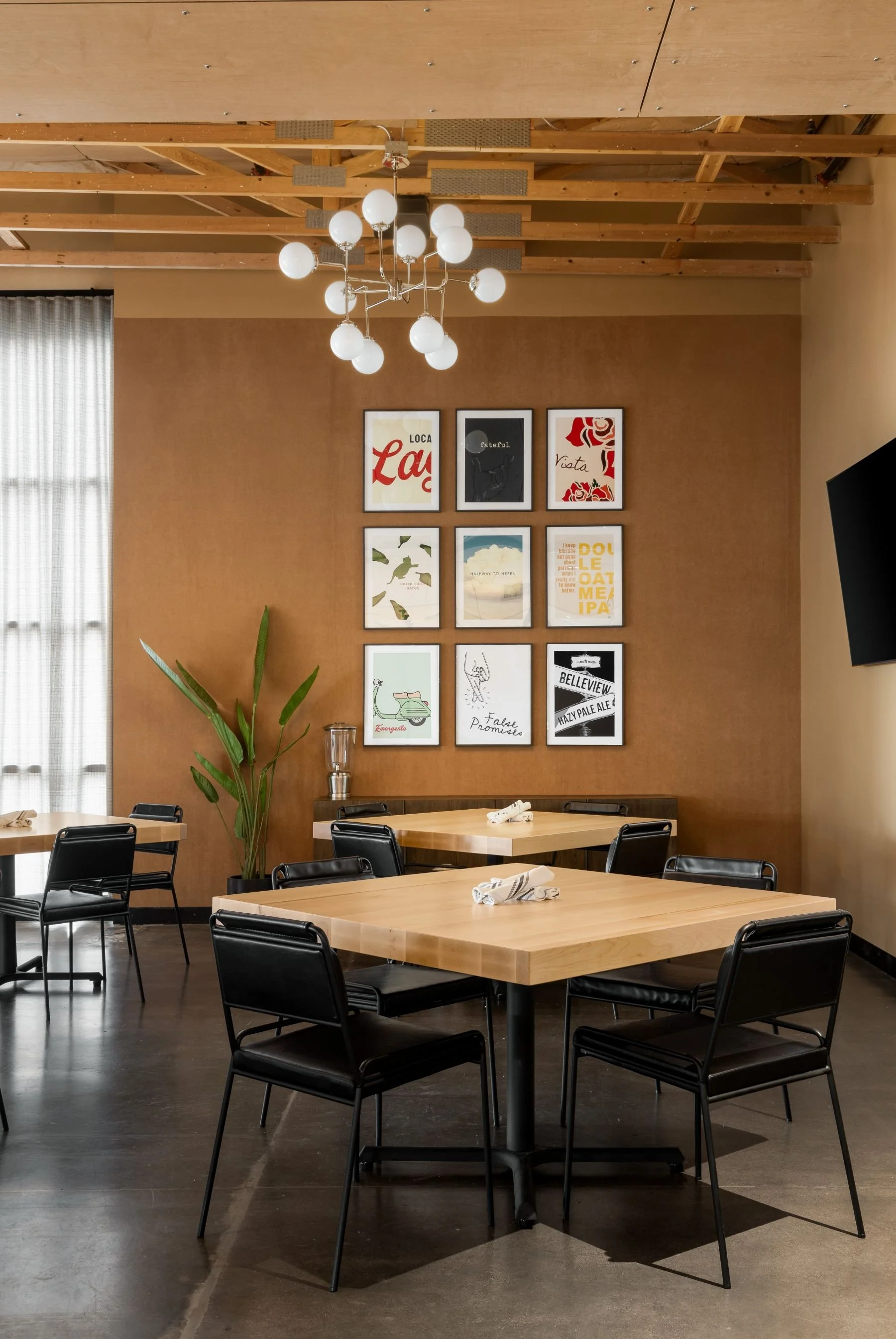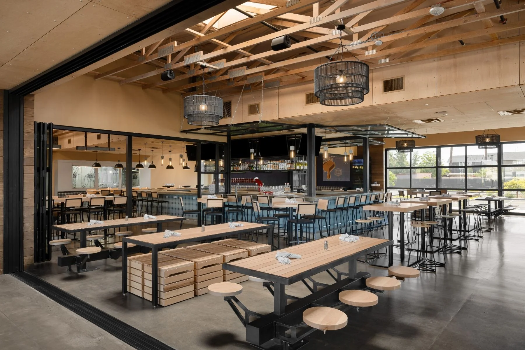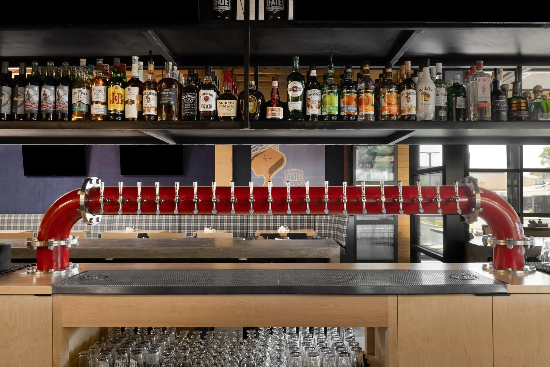 Phoenix, ArizonaFor Fate Brewing’s latest location, we set out to design a modern brewery that felt fresh, playful, and deeply rooted in the brand’s identity. Bold plaid patterns show up throughout the space—from the custom bar face to statement upholstery—paired with warm wood and steel picnic benches that invite guests to gather, linger, and enjoy. A corduroy-textured accent wall adds depth and a tactile moment of surprise, while the artwork throughout the space pulls directly from the brewery’s own beer can graphics, creating a cohesive and memorable experience. Every element was designed by our team to reflect the personality of the brand while reimagining what a neighborhood brewery can feel like.