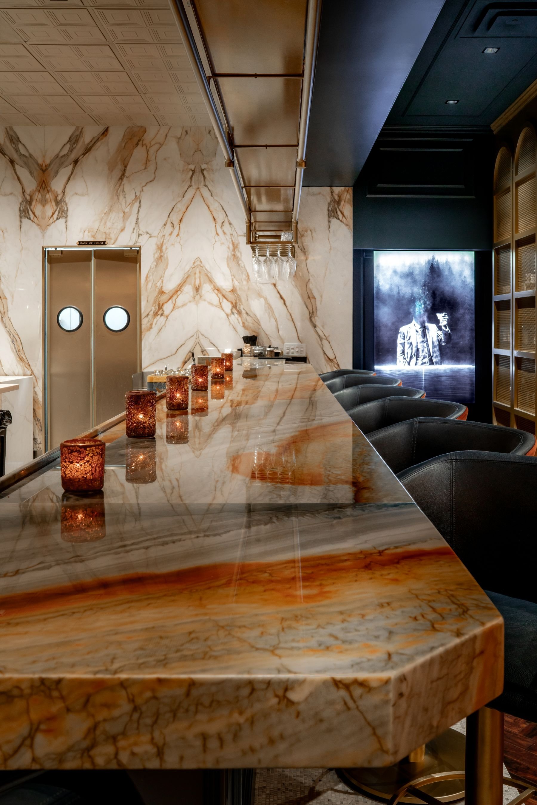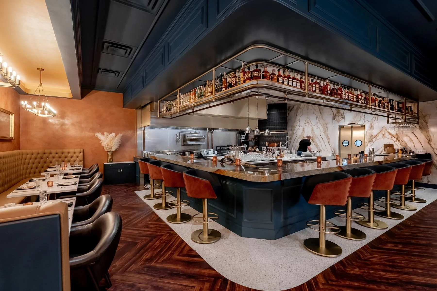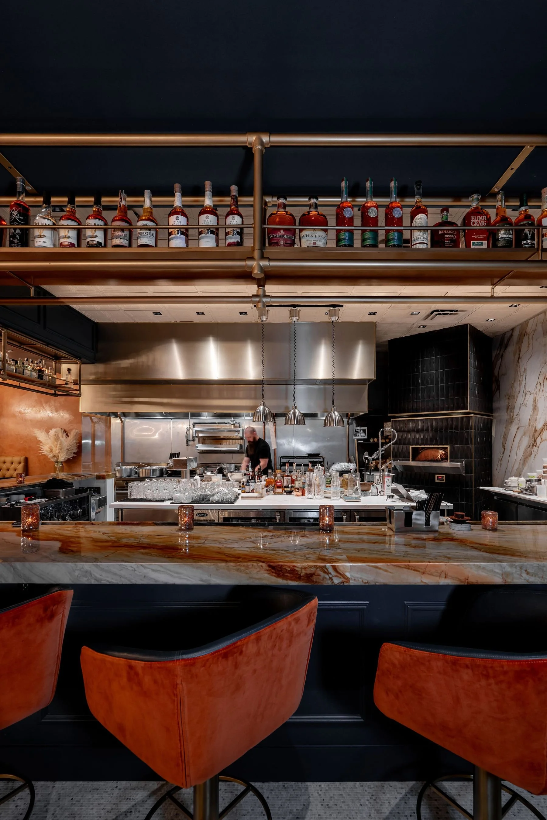 Peoria, ArizonaBarley & Smoke is where moody speakeasy vibes meet the energy of a live open kitchen. Every inch of the space was designed to feel intentional and intimate, from the jewel-toned palette to the jade quartzite bartop and the warmth of the wood-burning fireplace. With just 38 seats, all thoughtfully positioned to face the kitchen, it feels like every guest has a front-row seat to the show. Even with a small footprint, we made sure the space feels luxurious, layered, and full of hidden moments. It’s one of those projects where you can feel the passion in every detail—and we’re so proud of what our team brought to life here.
