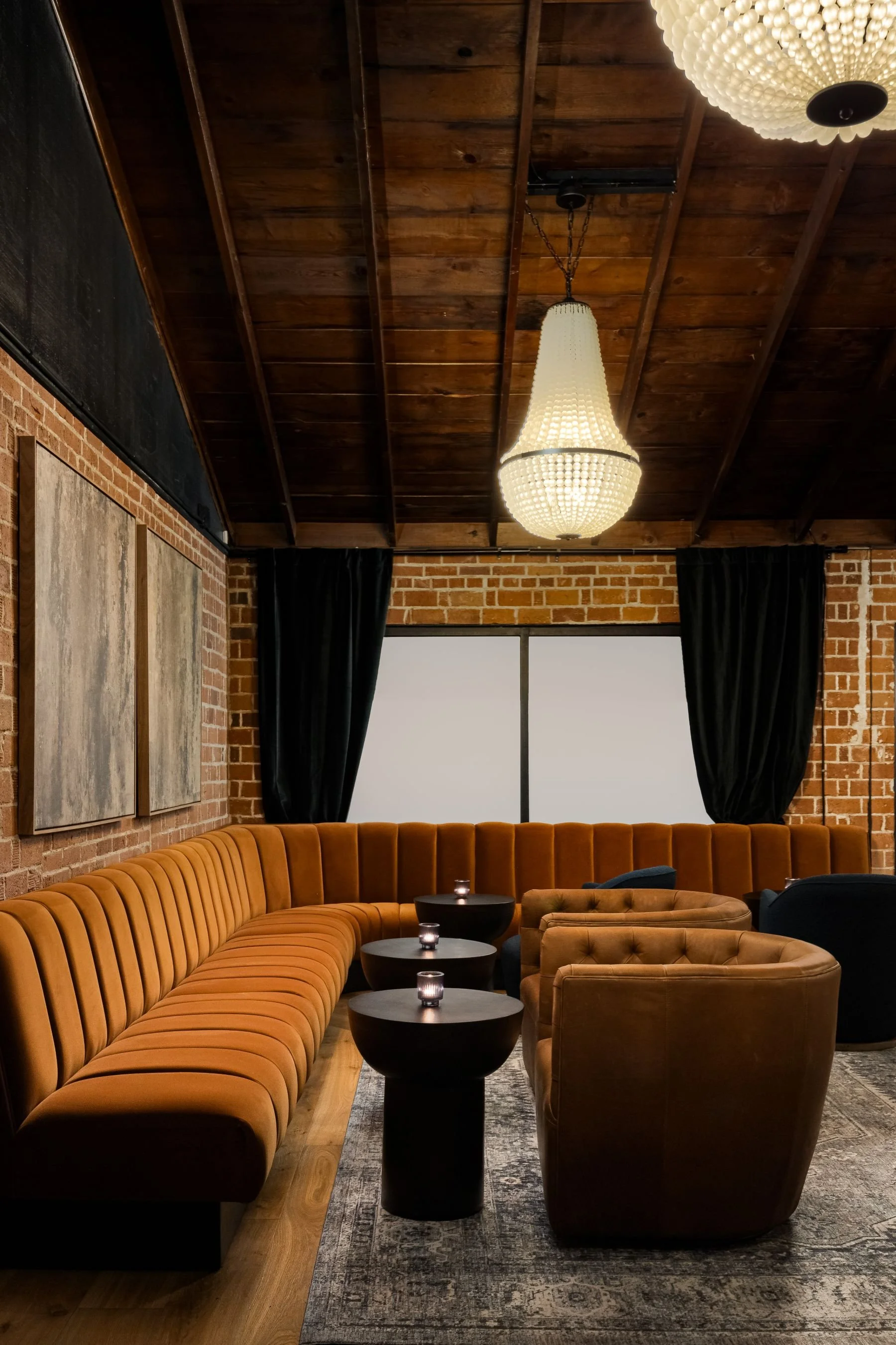 Austin, TexasDesigned as an intimate extension of The Guest House Austin, the Private Dining Room introduces a richly layered, jewel-box experience tailored for elevated gatherings. Centered around a custom live-edge dining table for up to 18 guests, the space is enveloped in deep burgundy tones, velvet drapery, and traditional paneling—creating a warm, immersive backdrop.
