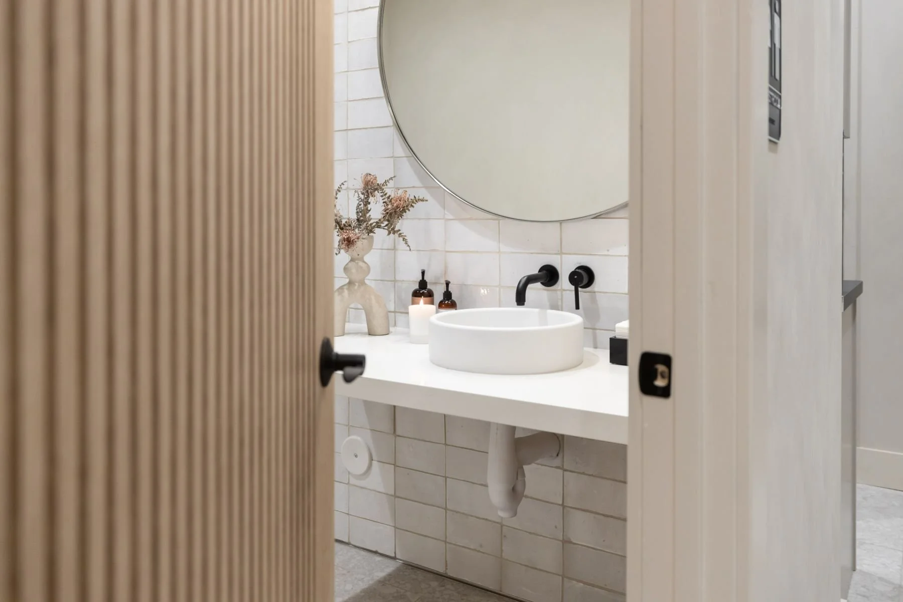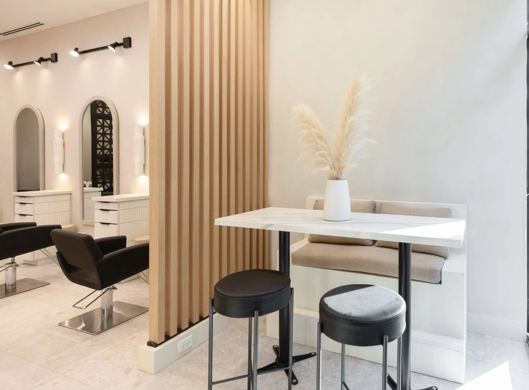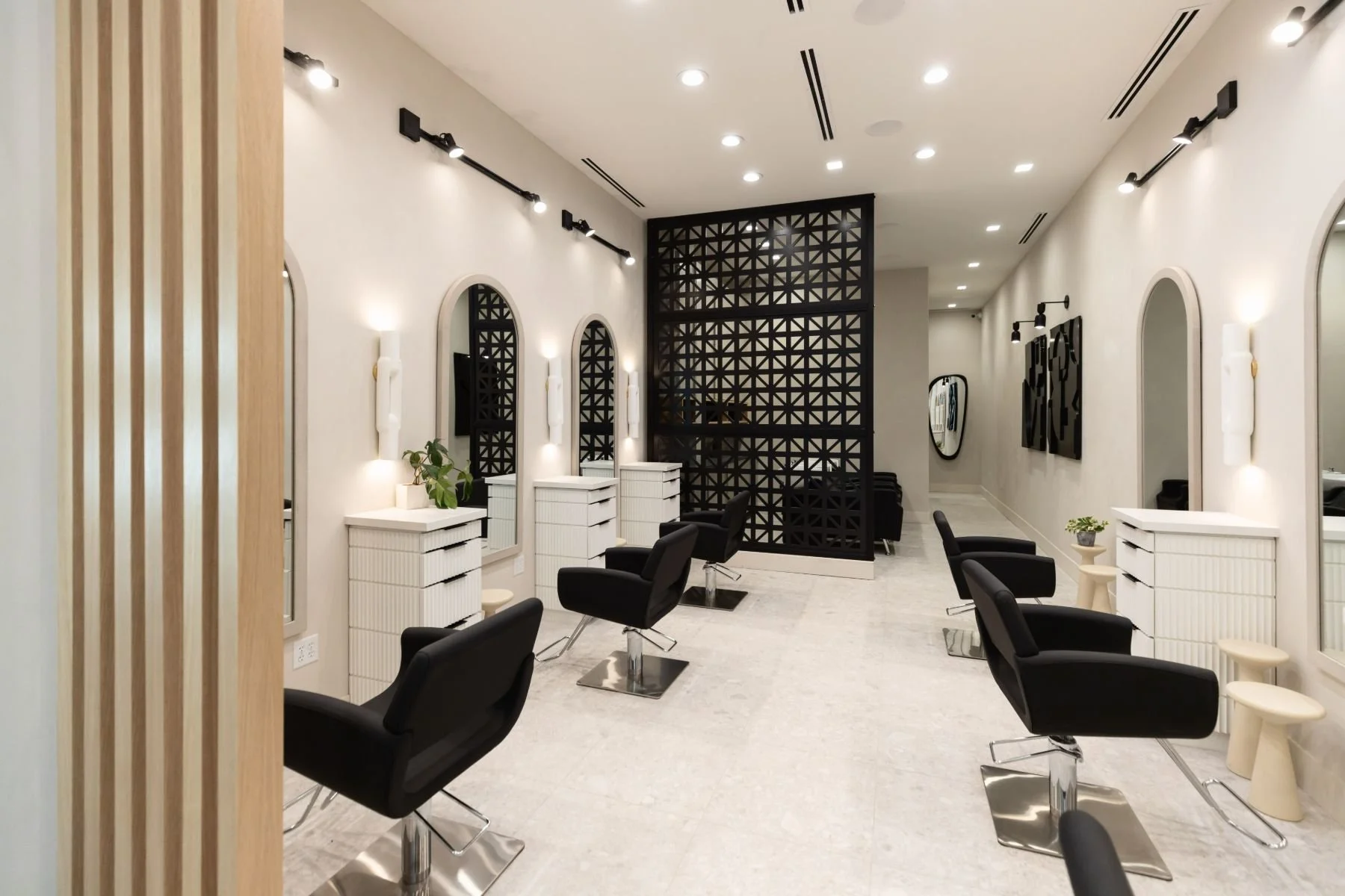 Verrado, ArizonaStudio Linea is an upscale salon designed to feel as warm and welcoming as the community it serves. With a neutral color palette, matte black metal accents, and soft modern lighting, the space strikes a perfect balance between elevated and approachable. Our team focused on lighting temperature and tone to ensure the environment not only looks beautiful but functions seamlessly for stylists and guests alike. Warm oak fluted millwork and organic textures bring a sense of calm and cohesion, while a highly efficient layout makes the most of its small footprint. The result is a space that feels considered, intimate, and effortlessly refined.