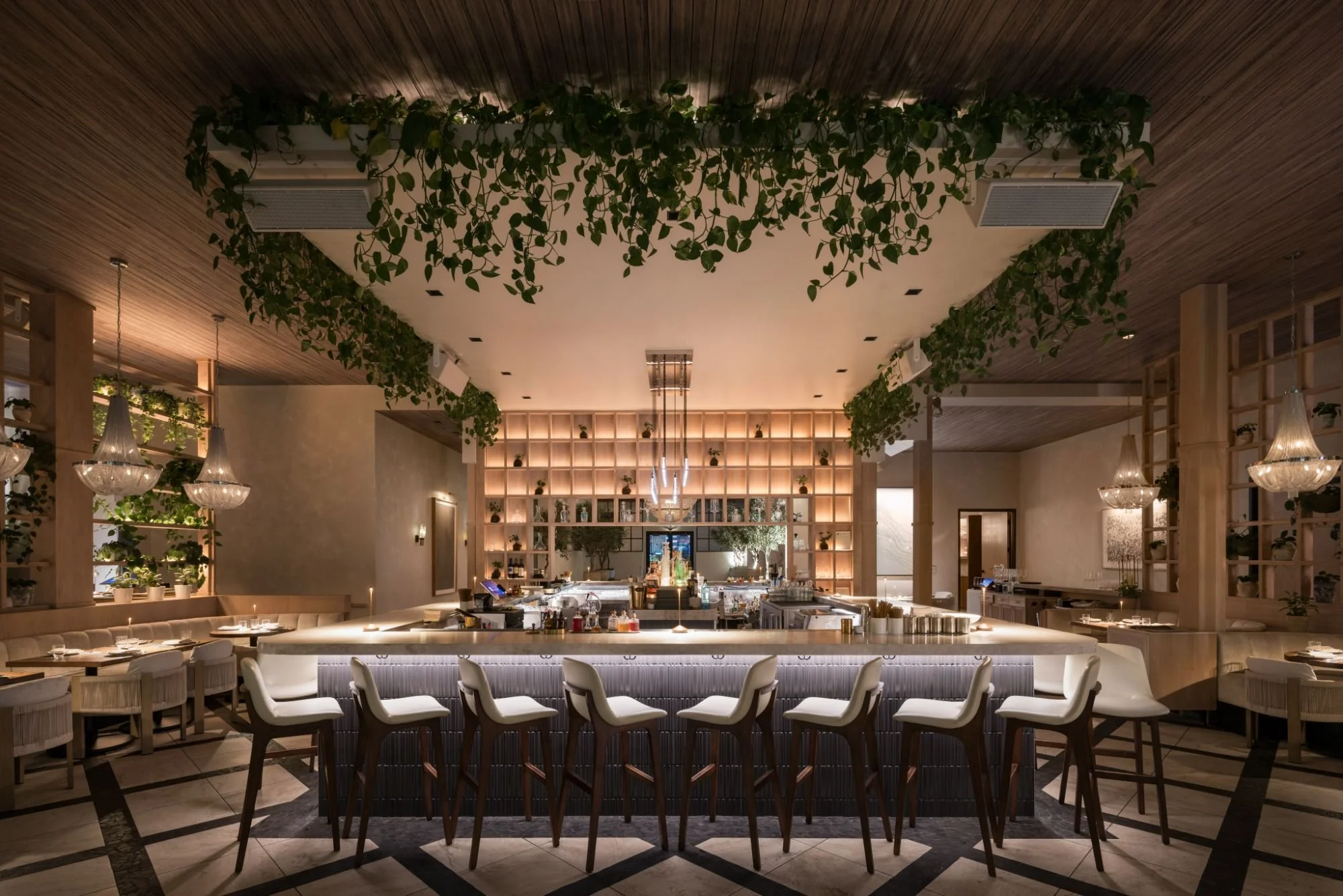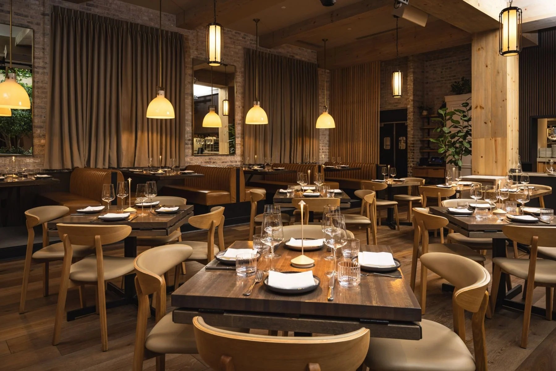 A rich, residentially inspired palette of warm woods, soft textiles, and collected materials sets the foundation, while sculptural lighting and layered textures bring depth and intrigue. The space unfolds through a series of distinct yet cohesive moments—from the lively bar to more intimate dining pockets—each designed to offer a different pace and perspective within the overall experience.